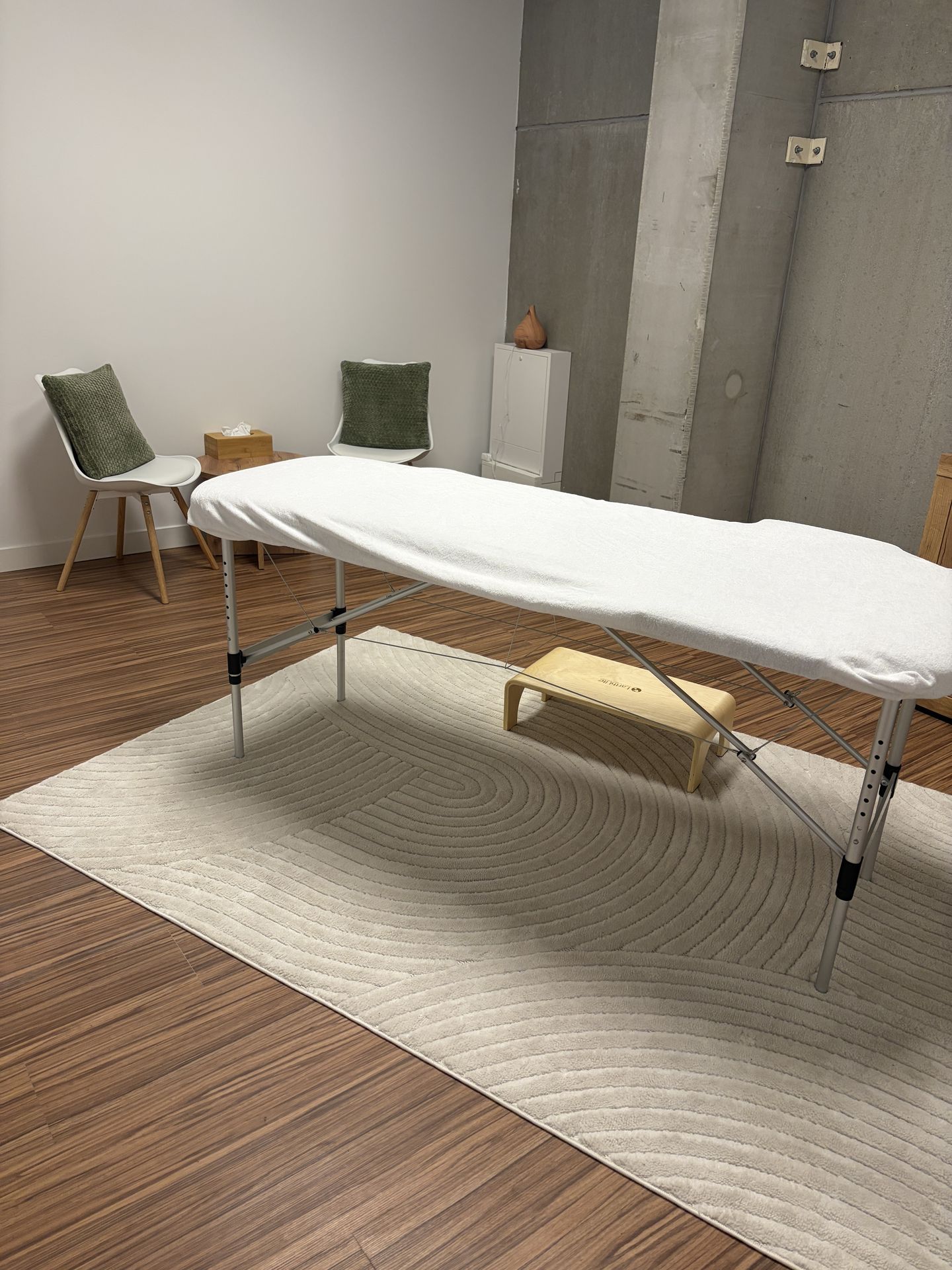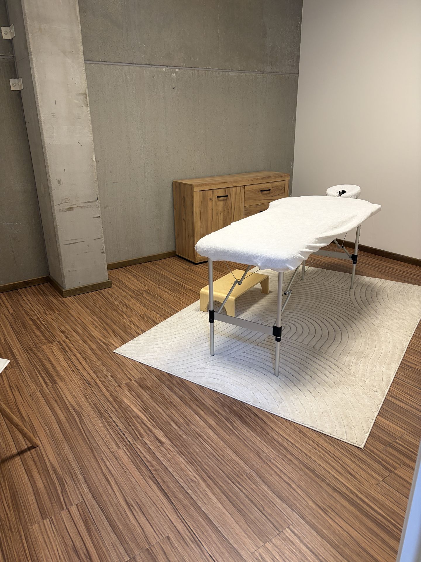 De andere ruimte is ingericht met een massagetafel en is ideaal voor klankschaaltherapie, massagetherapie en andere lichaamsgerichte behandelingen.